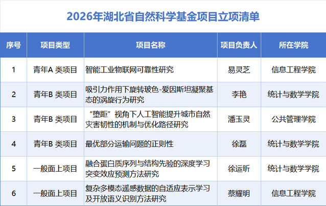 近日,湖北省科技厅下达2026年省自然科学基金项目,我校共获批6个项目,其中一般面上项目2项、青年项目4项(含青年A类项目1项),面上项目、青年项目立项总数创历史新高,青年A类项目实现突破。